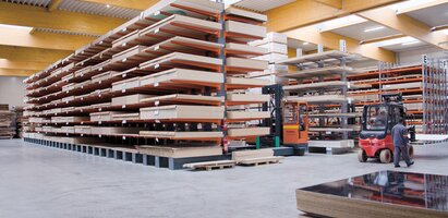 Disponibilitatea a aproximativ 8.915 articole listate – dintre care 3.294 sunt în stoc – produse de la toți producătorii cunoscuți, termene scurte de livrare și expertiza logistică remarcabilă sunt avantajul decisiv în comerțul cu lemn și materiale pe bază de lemn. Datorită unei structuri de depozitare interconectată, cu depozite centrale selective și o suprafață de depozitare acoperită de 30.000 m2, poți fi sigur că produsele solicitate frecvent sunt întotdeauna disponibile și comenzile tale pot fi procesate rapid. Timpul de livrare poate fi astfel redus semnificativ.