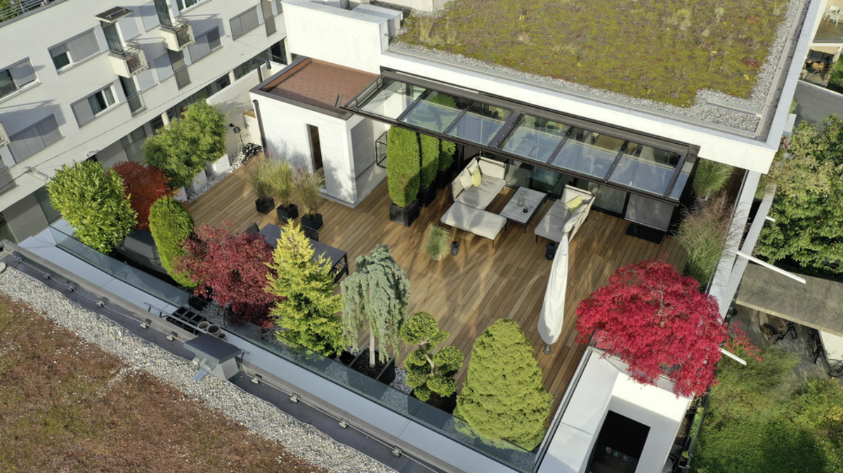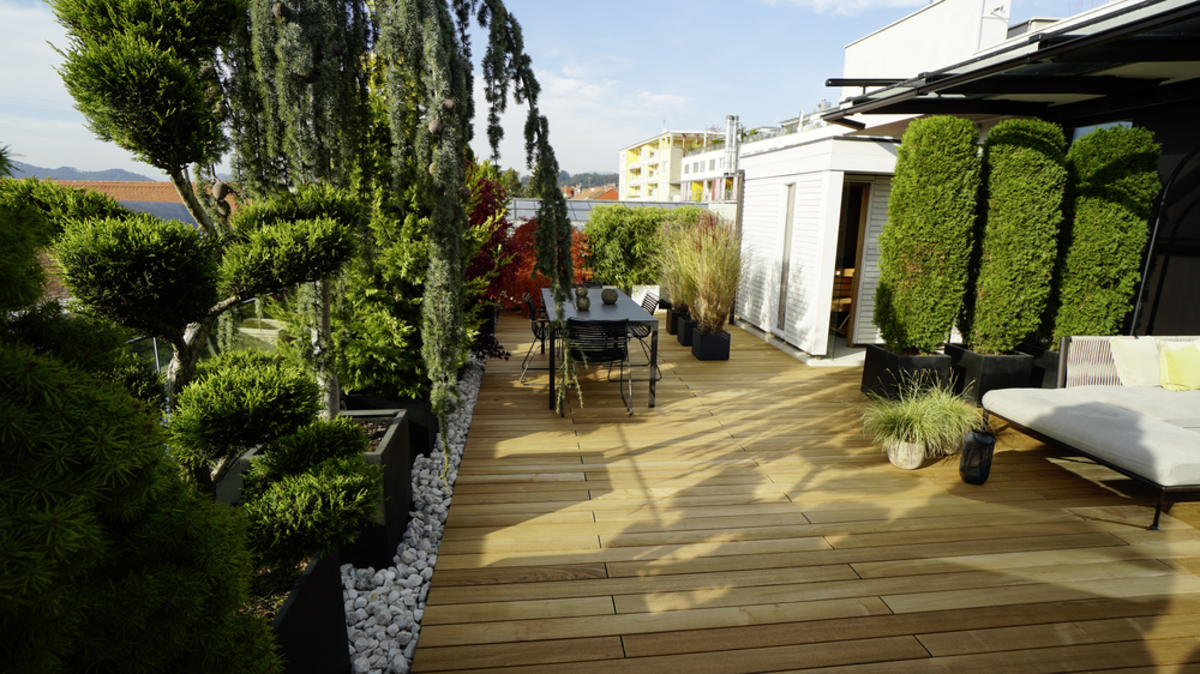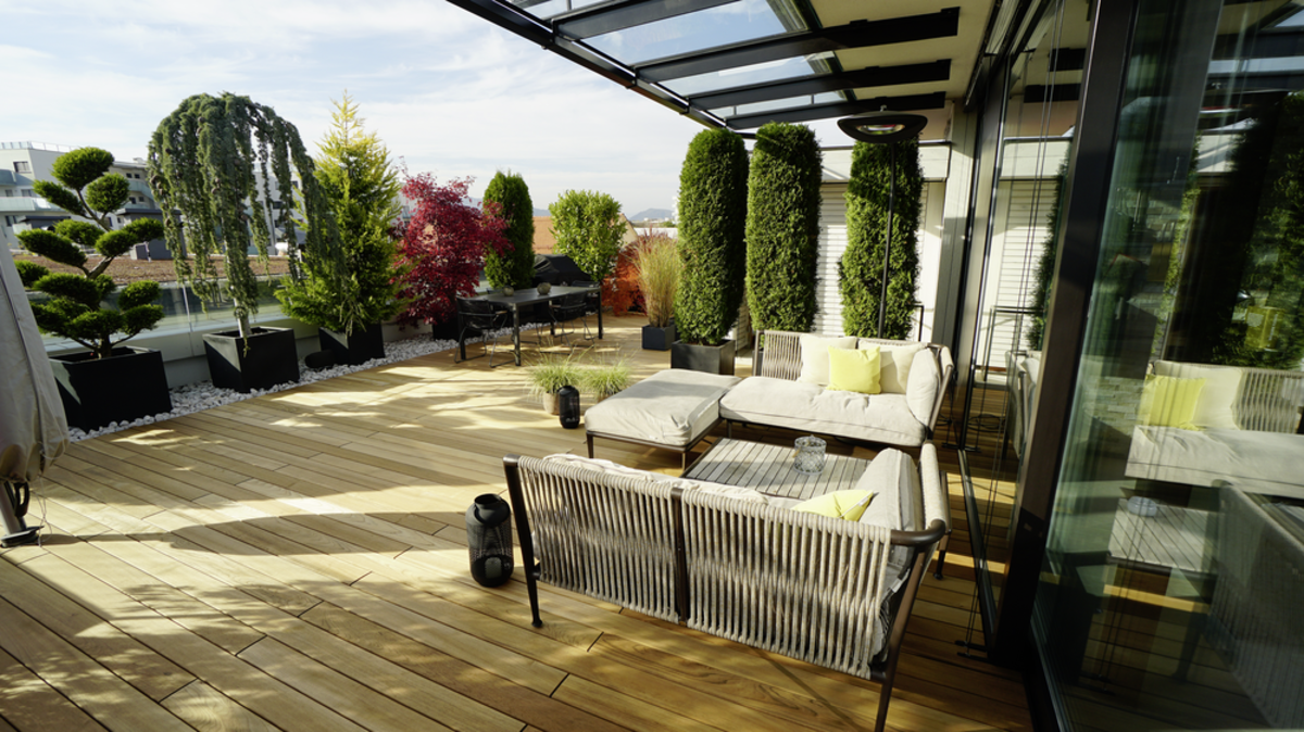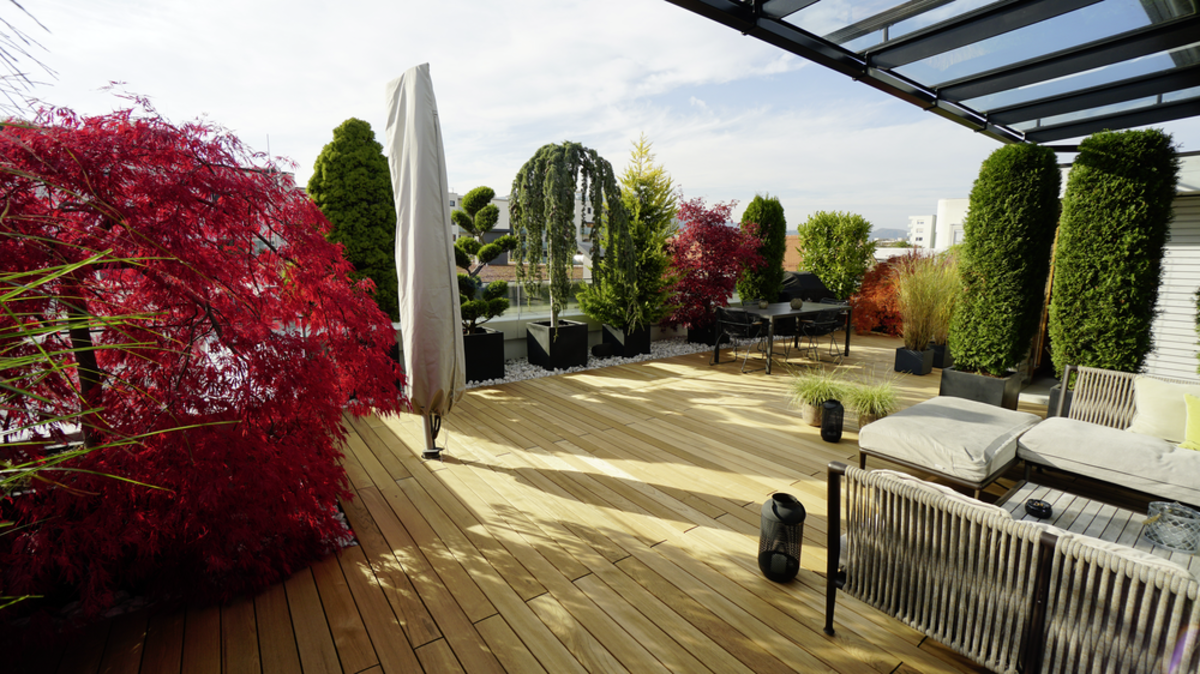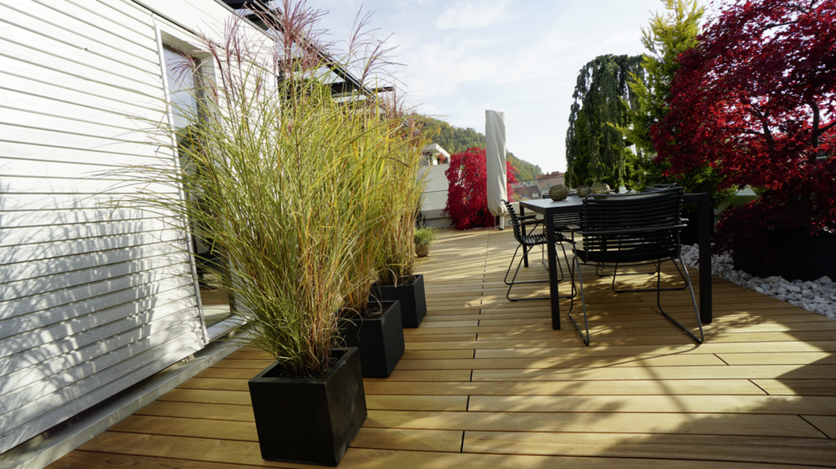 La doar o aruncătură de băț de centrul plin de viață al orașului, proprietarii și-au îndeplinit visul de a trăi aproape de natură. Terasa de pe acoperiș, realizată din lemn de tec nobil, completează casa cu o oază de bunăstare care promite relaxare pură. Datorită sistemului de instalare și a substructurii potrivite, podelele au fost așezate rapid și într-un mod profesionist. Consiliată și furnizată de J. A. F. Zengerer din Graz, terasa va oferi multe alte ore de relaxare la înălțimi aerisite.