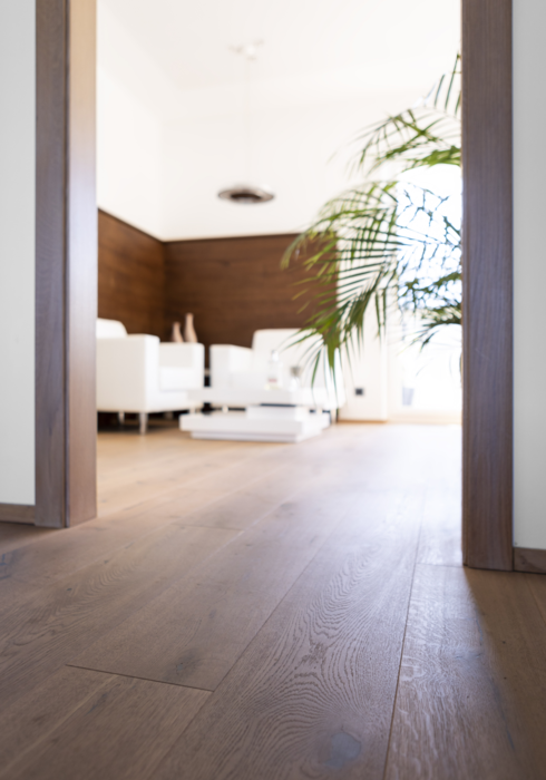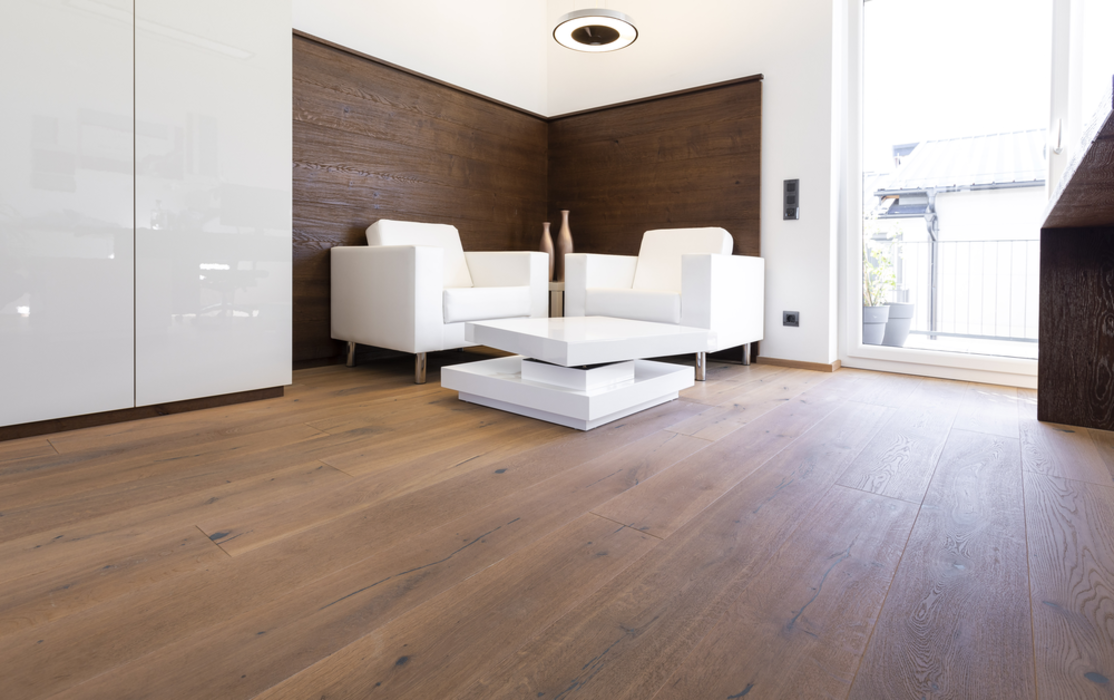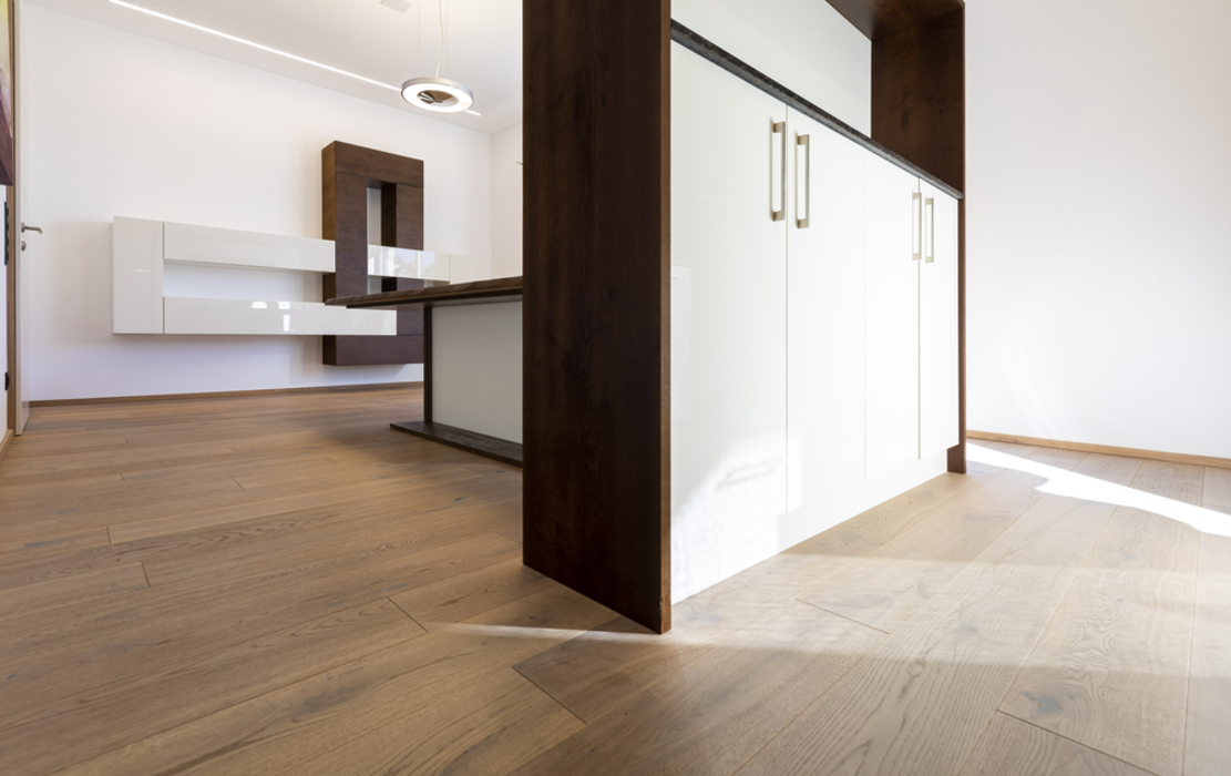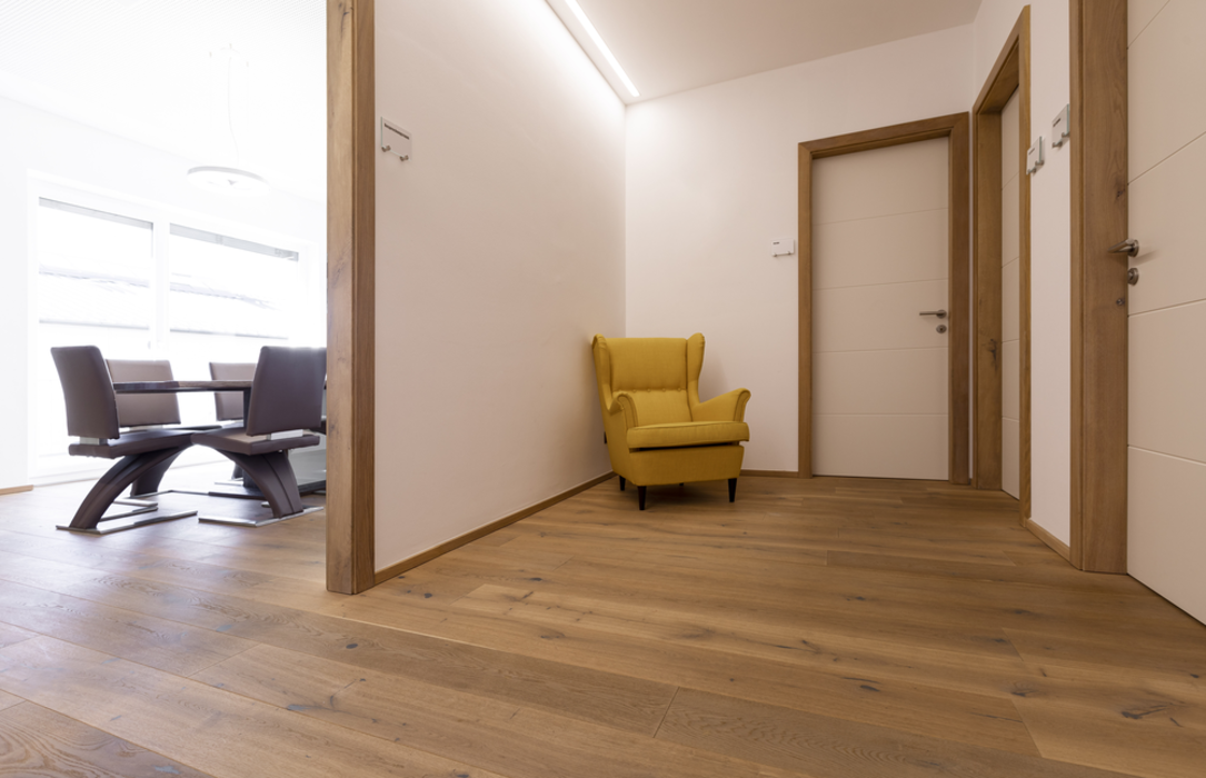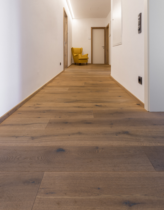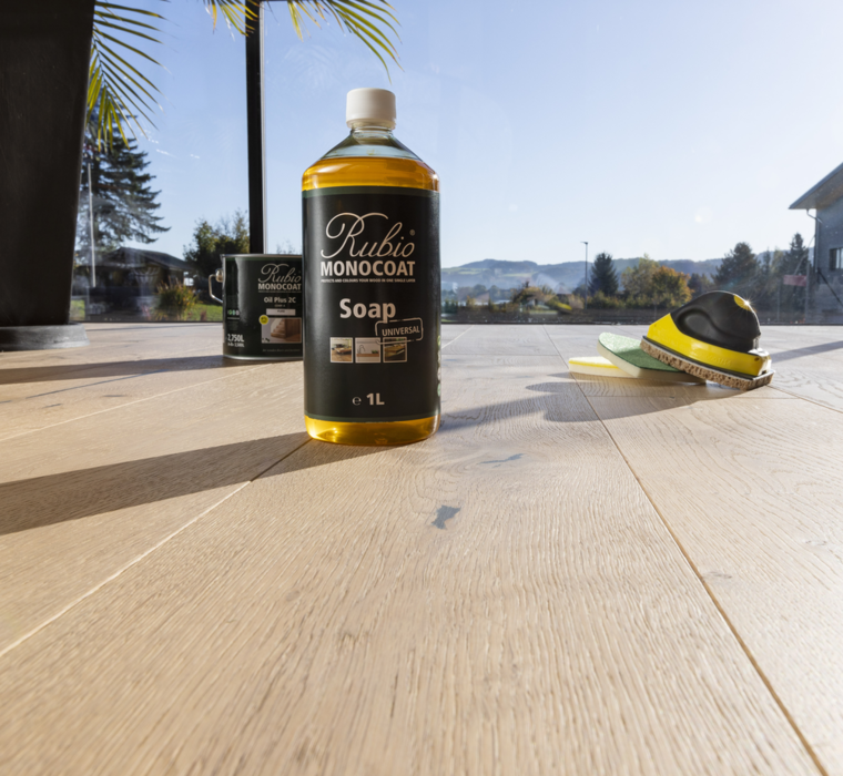 Material: Podea stejar triplustratificat, lăcuit cu ulei cu 10 % conținut de alb (comandă specială) | Plinte din stejar masiv, unse cu ulei alb | Rubio Monocoat Oil Plus A Kom - ponente Pure | Rubio Monocoat R331 White | Rubio Monocoat Soap Universal