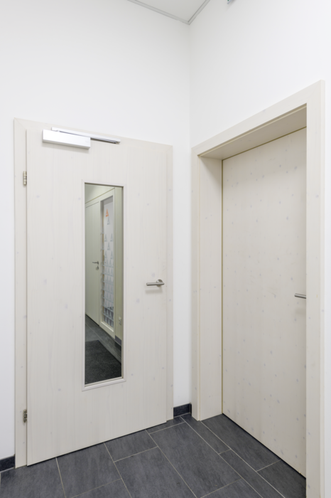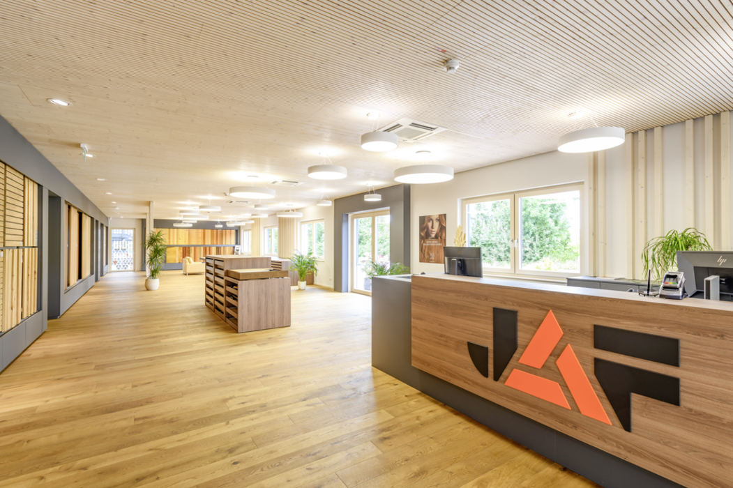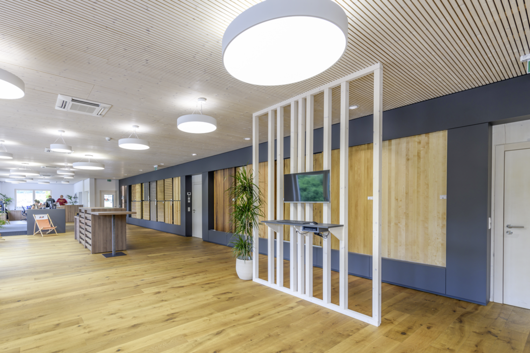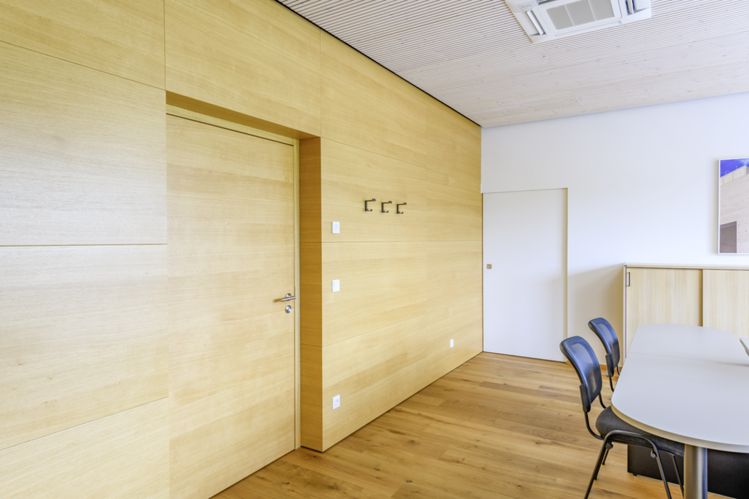 Atrăgătoare din punct de vedere vizual, pardoselile și ușile din noua filială se completează perfect cu restul mobilierului. Podelele din stejar masiv folosite în diferite zone ale clădirii, subliniază referința puternică la lemn. datorită gamei extinse de materiale, rezultatul final a fost o clădire deosebit de armonioasă din punct de vedere materiale, cu un interior plăcut din punct de vedere estetic, care te invită să zăbovești.