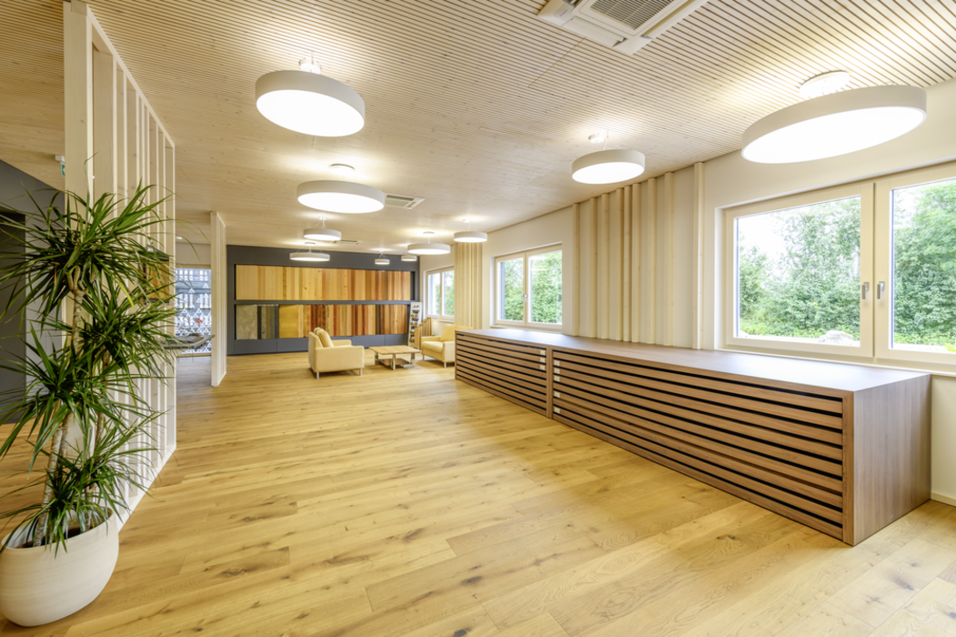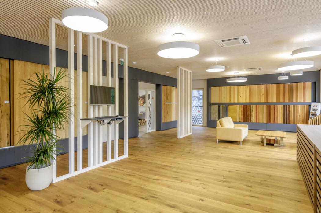 Și showroom-ul din St. Florian a fost pus în scenă în mod elegant. Clienții nu numai ca au acces la o varietate de produse expuse, ci pot vedea produsele în aplicare, prin obiectele de mobilier prezentate. Atrag atenția în mod special suprafețele din plăci compacte, care oferă o experiență specială prin aspectul lor elegant și plăcut.