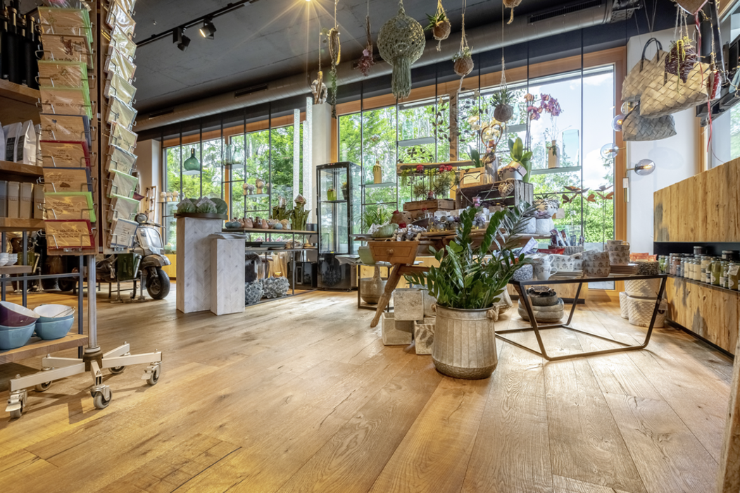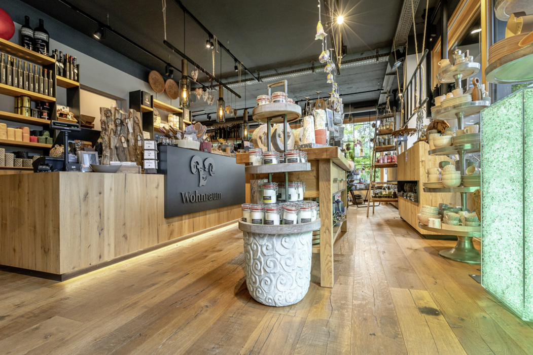 Într-un magazin de prezentare, o podea rezistentă de la J. u. A. Frischeis oferă o scenă perfectă pentru accesorii de decor, un vin bun și o cafenea adiacentă.