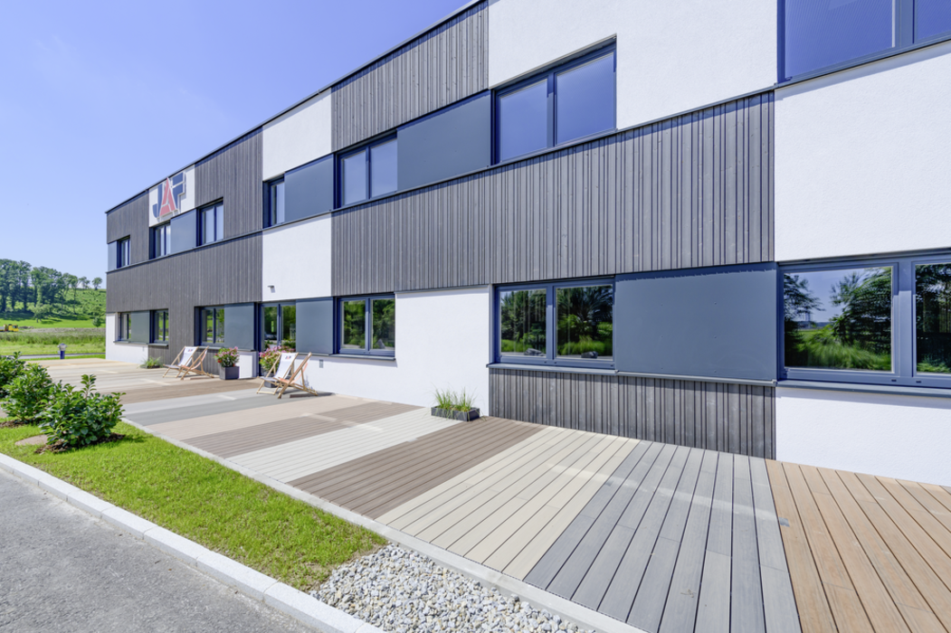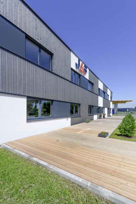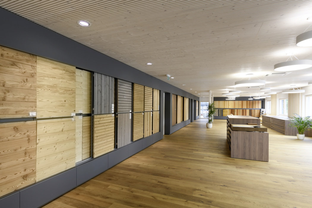 Atunci când o multinațională specializată în comerțul cu lemn și materiale pe bază de lemn decide să își extindă prezența cu o nouă locație, este firesc să folosească produse din gama proprie. Materiale din gama  J. u. A. Frischeis au fost folosite atât pentru aplicații interioare, cât și pentru aplicații exterioare. Astfel, clienții sosiți în showroom-ul din St. Florian pot vedea direct produsele puse în acțiune. Profilele de fațadă din molid, dar și plăcile decorative, creează o primă impresie atrăgătoare și primitoare.
