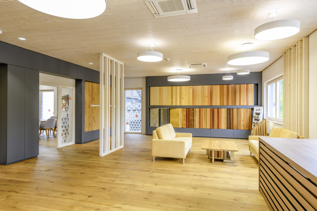În interiorul construcției au fost folosite elemente structurale. Accentul a fost pus pe estetica și interacțiunea vizuală cu produsele și pe proprietățile acestora tehnice. pentru nivelul superior al clădirii s-a optat pentru CLT-uri cu calitate vizibilă pe o parte. Caracterul natural și aspectul atrăgător conferă încăperilor o atmosferă deosebit de plăcută. Subiectul acusticii a fost de asemenea luat în considerare în construcția noii clădiri. Au fost instalate elemente NOVATOP ACUSTIC atât pe tavanul showroom-ului cât și în sălile de conferință.
